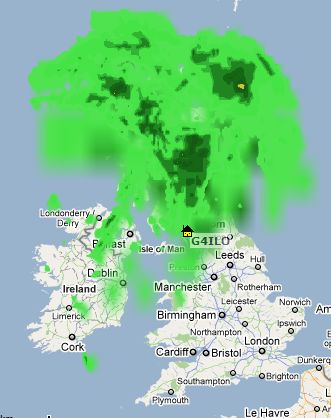 Today when I turned on the radio I tuned both 2m and 6m without hearing a single signal. The map on the right probably shows why. We awoke to heavy rain and gale force winds, and I immediately thought of those poor guys on hilltop sites with their guyed poles supporting their beam antennas. If the wind didn’t force them to take the antennas down I dare say the rain and the poor propagation made them decide they might just as well give up.