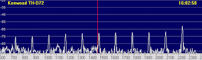 When you look at the signal from my WX-1 weather station, which is modulating a Radiometrix VHF transmitter module, the peak signal levels are close to that of the Kenwoods. The lower frequency components are in fact a couple of dB stronger. However, it’s clear that the frequencies are too high. The top peak, which should be 2200Hz, is about 2290Hz. And the one closest to 1200Hz is about 1230Hz. When setting up my FoxTrak APRS tracker I had to set the frequencies using the PIC calibration routine as low as they would go before my TH-D710 would decide it, so clearly it is the frequency offset that is responsible for the packets not being decoded. The WX-1 firmware unfortunately does not have a calibration procedure. Either the PIC clock crystal needs to be slowed down a bit or I need to make a change in the source code to shift the frequencies and recompile the firmware.