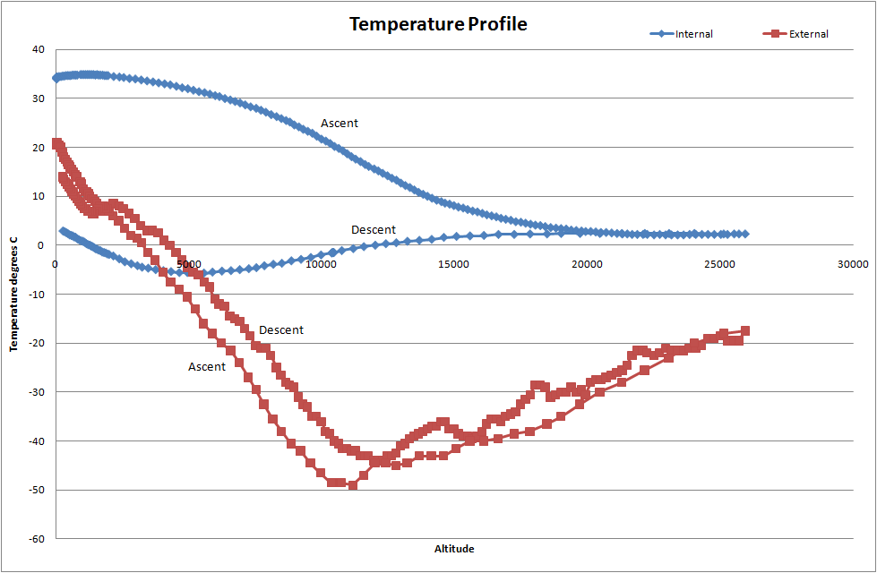 The graph shows internal/external temperature recorded by PINKY against altitude, there are two plots for each showing the ascent profile and the decent. The lowest temperature recorded by the external temperature was -49.5°C (-57.1°F) and the foam did a good job of insulating the internal electronics, though it drop below 0°C during the decent.