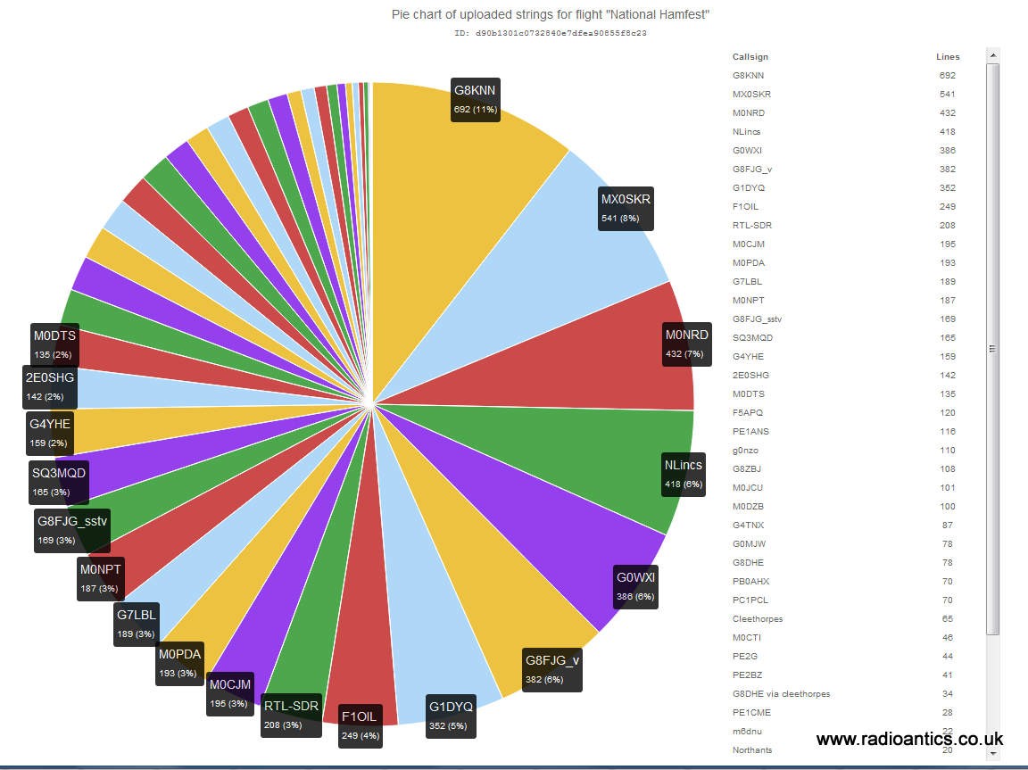 Well it all worked extremely well, and got a lot of decodes as can be seen by the pie-chart generated by the habitat.habhub.org system, the third best receiver only bettered by Dave himself (M0RPI) and a station nearer to the flight path.