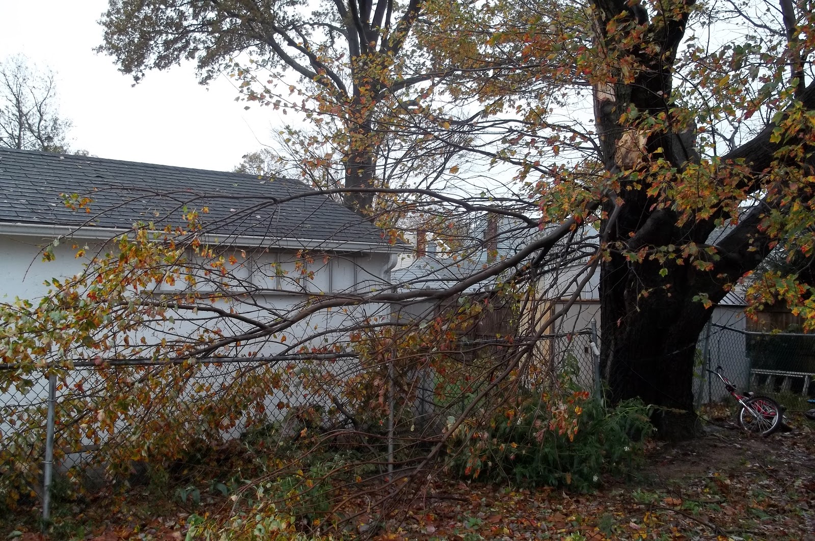 So far, recorded gusts from nearby weather stations have topped out at 45 MPH. That may double as Sandy makes landfall. I heard a loud crack before. Turns out a branch in the neighbor’s back yard snapped. Hope that’s not in store for us.