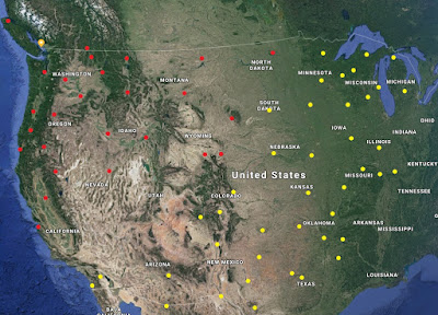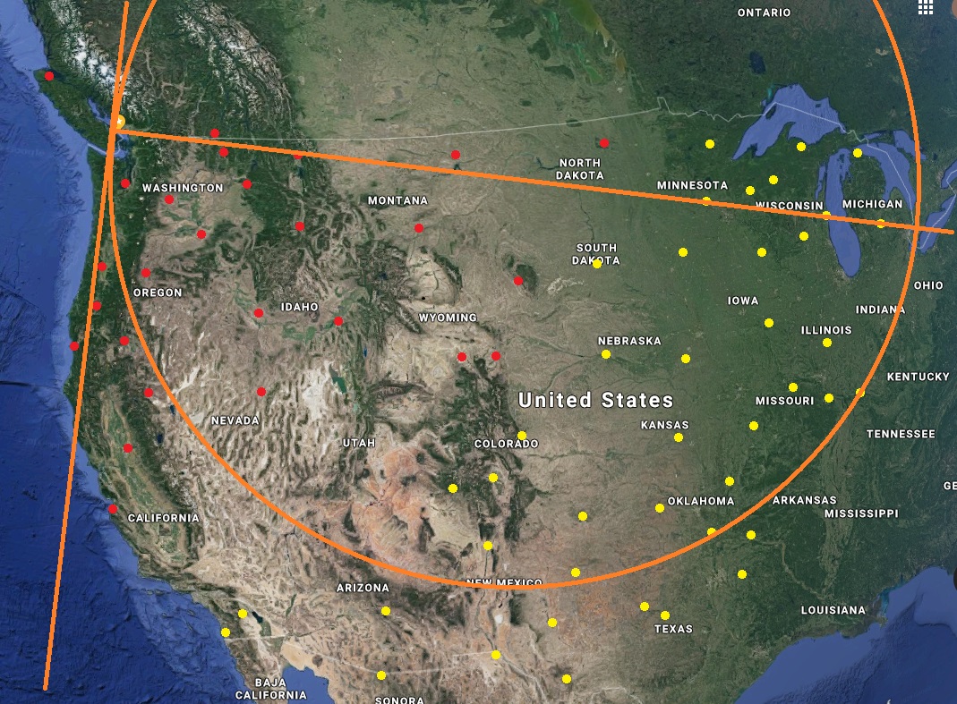 The next 41 closest stations are now plotted below in yellow, showing the most likely source of these signals. The distances illustrated are in-line with single and double-hop E-layer or possibly lower F-layer refraction.