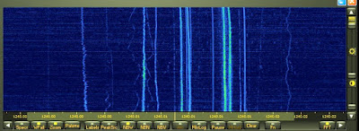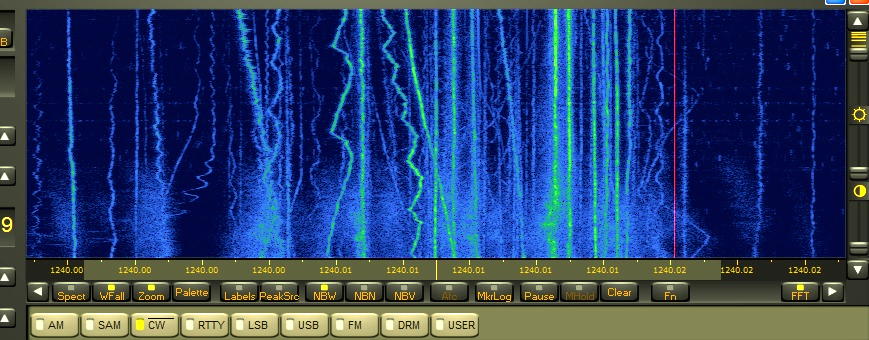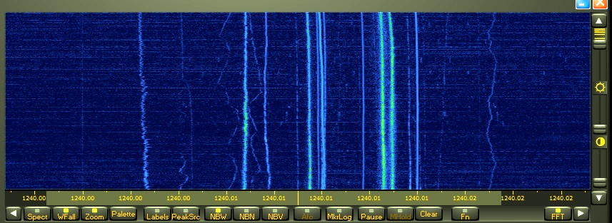 At 1500 hours local time, I wasn’t hearing any audio on 1240 but a weak carrier could be detected audibly. Using my Perseus SDR’s waterfall in its narrowest possible window, produces an extremely narrow passband, effectively increasing the sensitivity by a huge factor. This allows the waterfall to display weak signals that are presently being propagated to my location but far too weak to be heard by ear. I’m estimating that in this narrow bandwidth, it can dig about 30 dB or more into the noise, but there is a price to be paid for this extra gain .... time!