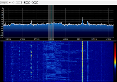 While the antenna isn't optimised for 80m, signals can be seen as well as noise. Before you get excited this noise has been present for quite a while and isn't being caused by the new Netgear devices. This noise is what I suspected was generated by PLT devices used by my neighbours.