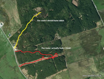 It looked short and simple so didn't take a map or the GPS with me. I found a gate and what seemed like a path along a wall and set off and quickly the path became indistinct and the trees were indeed very dense, so dense I was struggling to get through them. But I carried on going up gaining altitude thinking I must be nearing the top, however it got to the point I just couldn’t get through the trees anymore and there was no sign of them thinning out as they supposedly did at the summit. It started raining and was having to negotiate water filled hollows, heather and bracken hummocks and swarms of midges - this was not fun!