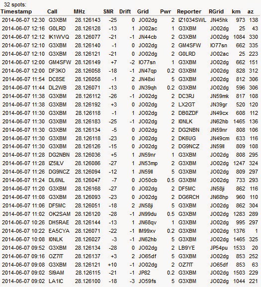 For a change, this morning I went on 10m rather than 6m. I had to disconnect the antennas early on because of a passing thunderstorm, but these are the results up to now with 2W out. Basically a fair scatter of 10m Es WSPR spots given and received from across Europe. No DX from outside Europe seen (yet). Hopefully will see some South Americans later.