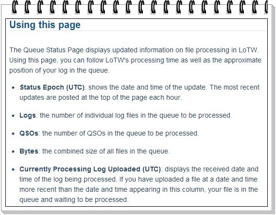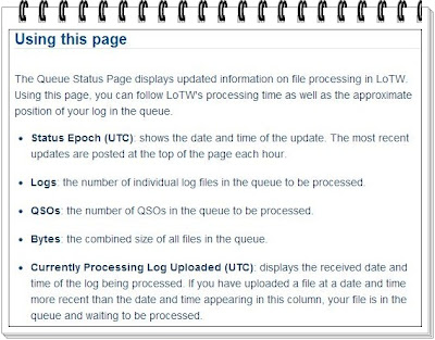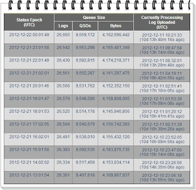As of 21 December 2012 at 1301 UTC approximately (n = 26,301) individual logs are in the LoTW queue for processing then on 22 December 2012 at 0001 UTC approximately (n = 26,665) individual logs are awaiting processing with a 10 day, 14 hour, 40m, 16s backlog of credits yet processed.