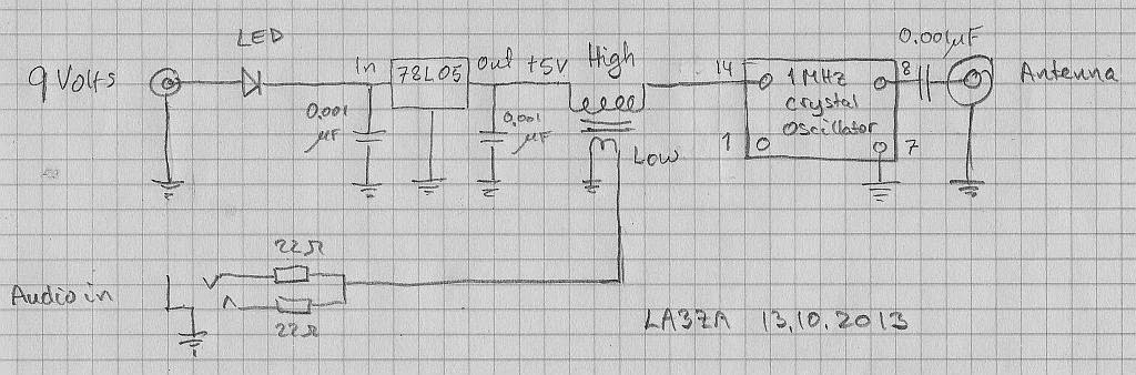 The design was inspired by one from Instructables, but mine also has a 78L05 5 Volt voltage regulator and a red LED in series with the power supply. It indicates that the battery is plugged in. In total the transmitter draws 4.4 mA at 9 Volts. The input power to the oscillator is less than 5 Volts * 4.4 mA or in the order of 20 mW. The power output is just a fraction of that. I have tested it with a 1.5 m wire hanging down behind the built-in frame antenna in the back of the radio with good results.