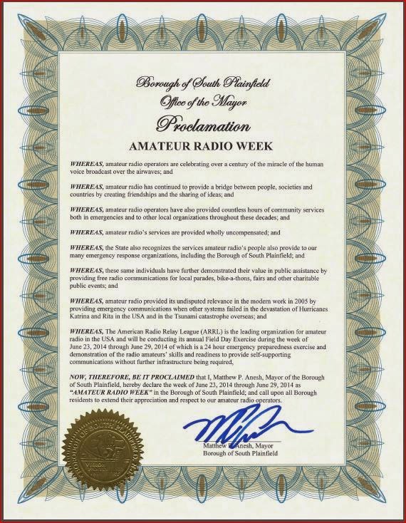 I attended the Town Council meeting in South Plainfield, NJ. Our mayor issued a proclamation declaring June 23rd through June 29th as Amateur Radio Week in South Plainfield. Most of the members of the South Plainfield Amateur Radio Club were on hand, and we had our picture taken with the mayor.
