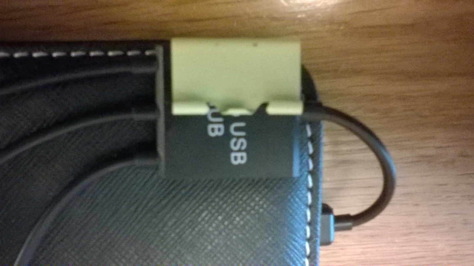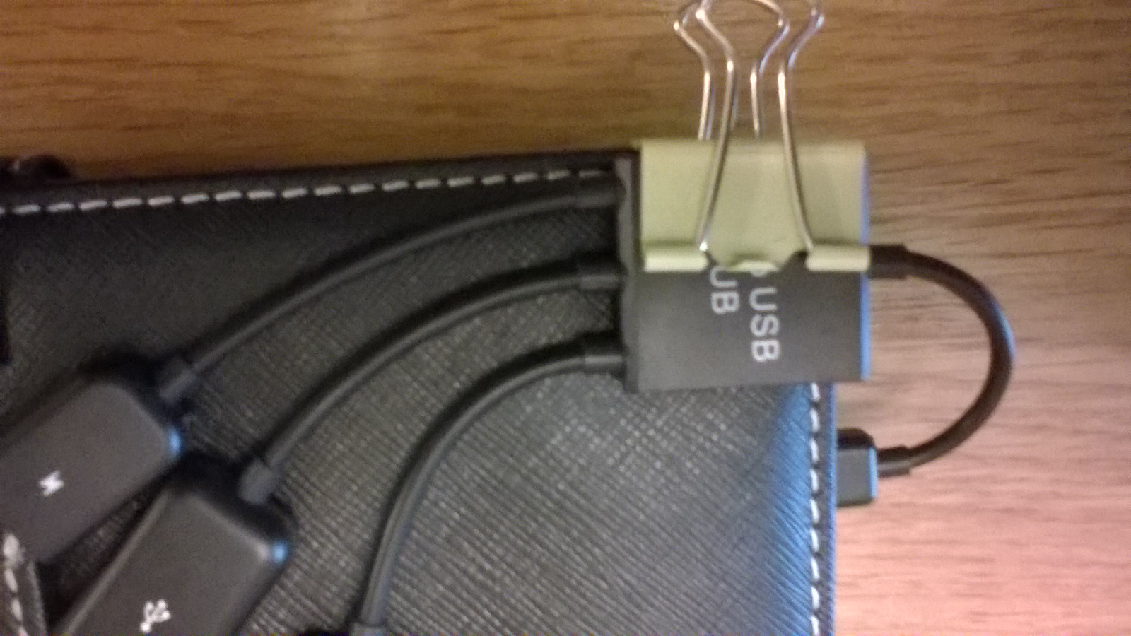 This was a slightly tighter fit under the binder clip due to the hub casing being slightly thicker, but all is now well, I can now charge the tablet without removing the mini USB from the side of the tablet, plus I have three USB sockets at hand, one which is taken up with the USB keyboard in the case: