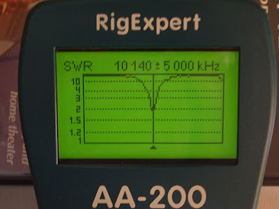It would have been difficult to make this antenna without an antenna analyzer like my RigExpert AA-200 which displays the SWR across a range of frequencies graphically. With my first attempt at the inductor it was possible to obtain an SWR null at 10.140MHz but it was rather a broad dip and the minimum was around 3:1. However at lower frequencies I saw that I was able to obtain a much deeper, sharper null. This made it clear that what I needed to do was remove some turns until the deep, sharp null was at the frequency I wanted. A deep null indicates higher Q and therefore better efficiency.