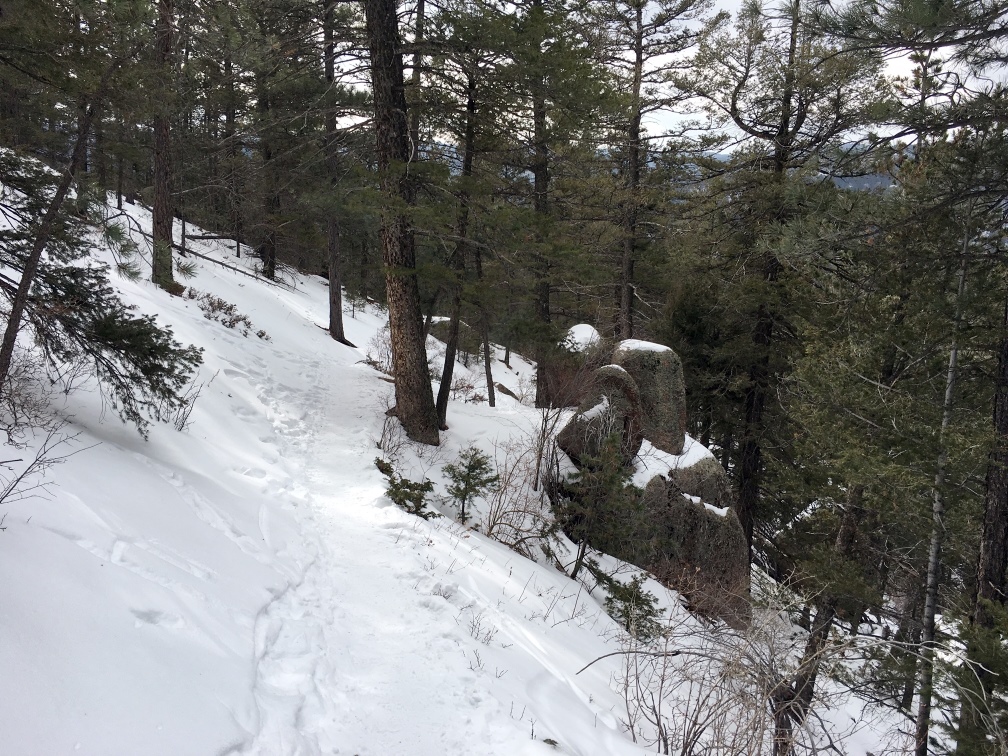 The road to the trailhead was in good condition but snowpacked and icy. This road is not plowed during the winter but it is often passable with a decent 4WD vehicle. Today, you could make it to the trailhead with 2WD and some careful driving. The trail conditions were typical for winter time: almost completely covered in snow with a few bare spots showing here and there. The trail was packed powder and not particularly icy. Still, we appreciated having traction devices on our boots. This trail can be downright treacherous when it ices up, so traction devices (Yaktrax, Microspikes, etc.) are highly recommended. Trekking poles can be helpful, too.